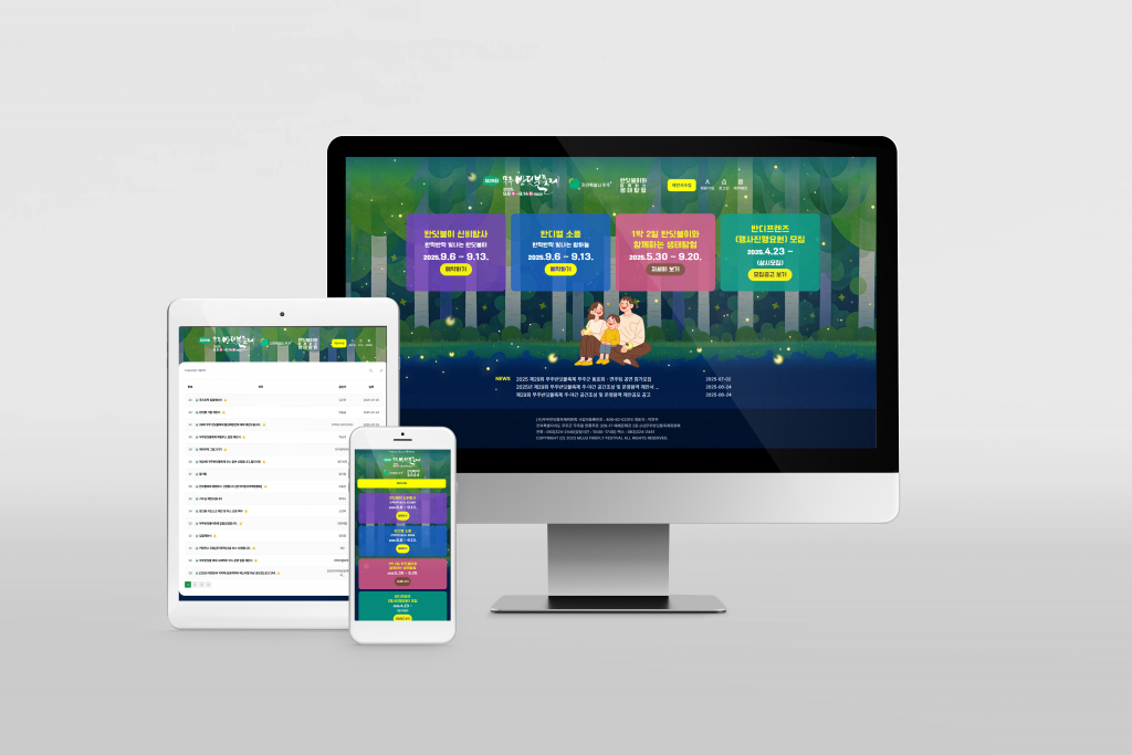 무주반딧불축제의 분위기와 세계관을 살린 비주얼을 중심으로, PC·태블릿·모바일 환경에 자연스럽게 대응하는 반응형 웹으로 디자인했습니다. 행사 정보와 프로그램 접근성을 높이기 위해 카드형 콘텐츠 구조와 직관적인 UI를 적용했으며, 다양한 디바이스에서 실제 사용 모습을 한눈에 확인할 수 있도록 목업으로 구성했습니다.