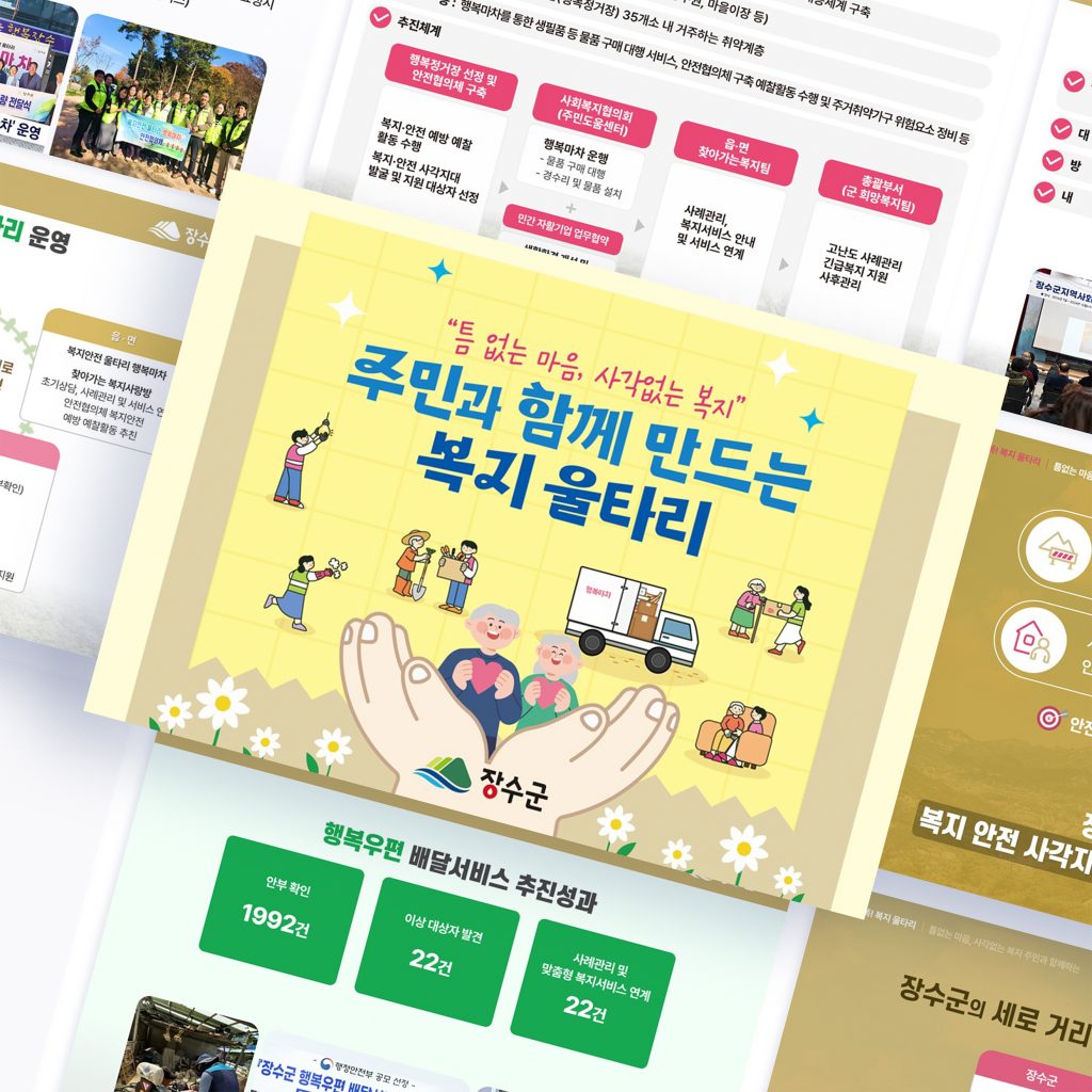 장수군의 복지 정책을 밝고 따뜻한 색감과 일러스트 중심의 비주얼로 풀어내어, 주민에게 한층 친근하게 다가가는 PPT 디자인입니다. 성과·체계·사례를 카드형 레이아웃과 명확한 정보 구조로 정리해 가독성과 이해도를 높였고, 발표 상황에서도 핵심 내용이 자연스럽게 전달되도록 구성했습니다. 행정 자료로서의 신뢰감은 유지하면서도 공감과 메시지 전달력을 함께 담아낸 안정적이고 설득력 있는 디자인이 돋보입니다.