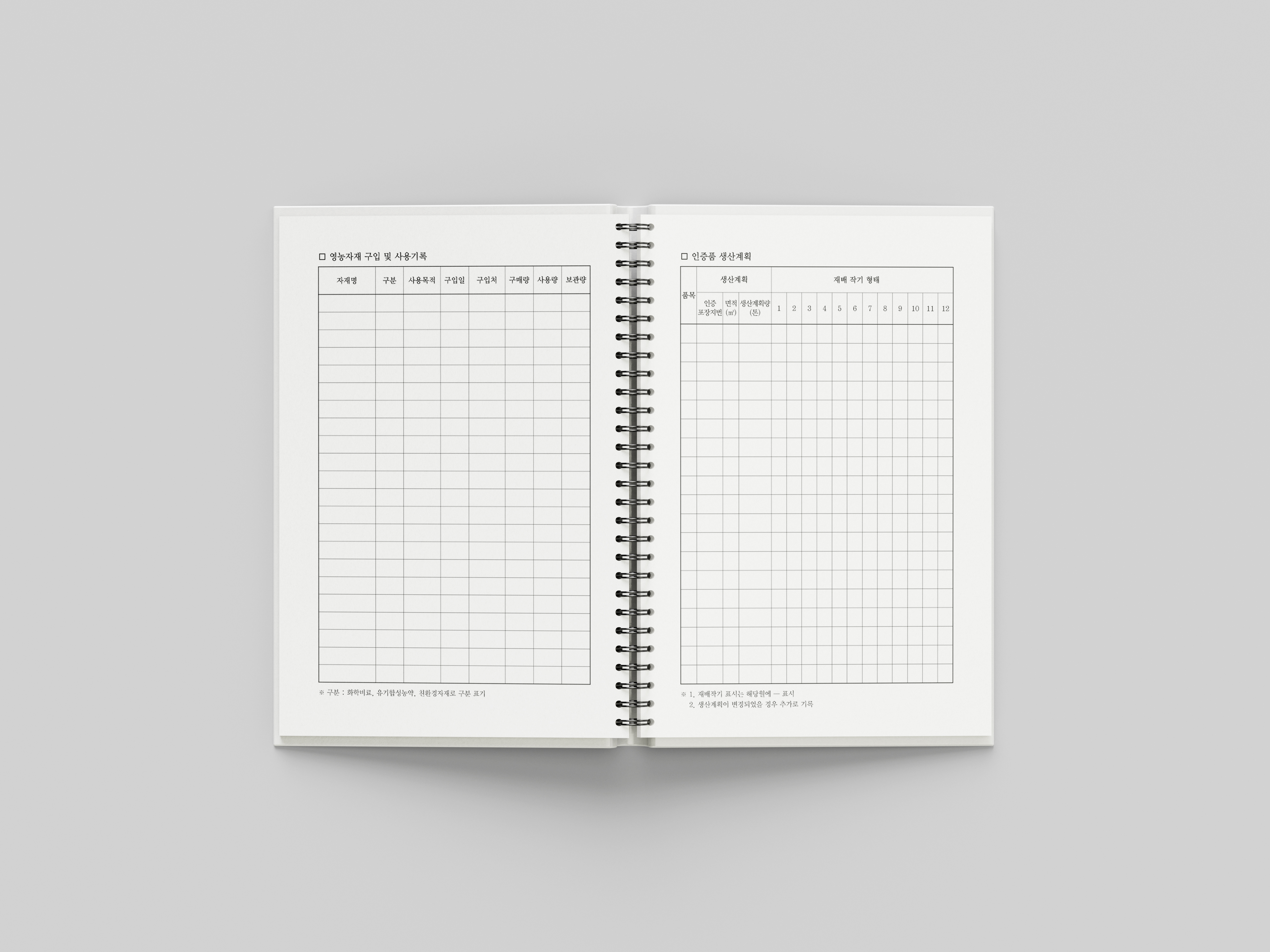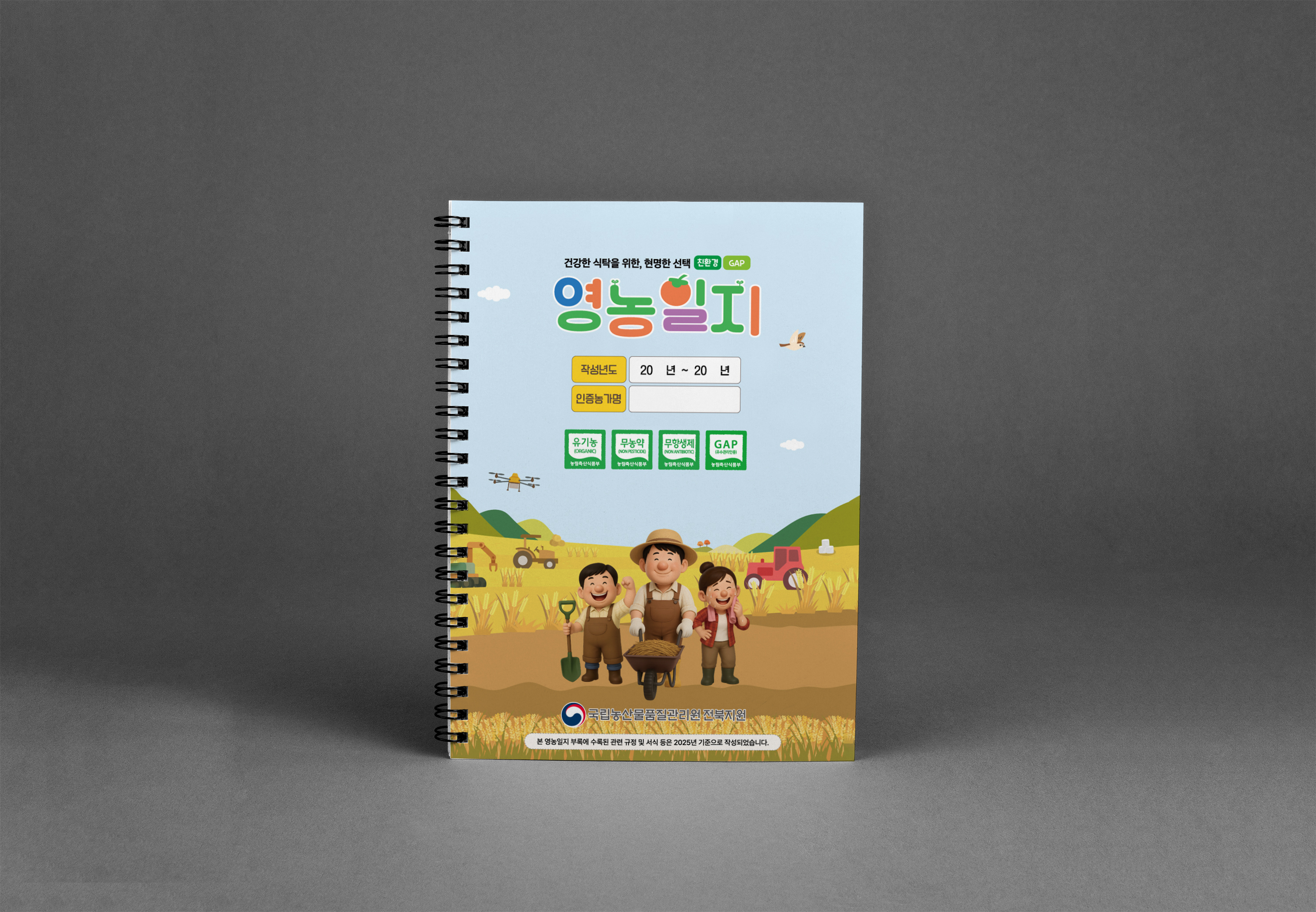 농산물품질관리원 영농일지 하드커버 농산물품질관리원 영농일지 하드커버 제작 CLIENT 농산물품질관리원 PERIOD 2025-11-10~2025-12-11 TYPE 하드커버 스프링 제본 영농일지는 현장 활용을 고려해 튼튼한 하드커버 싸바리와 스프링 제본 방식으로 제작했습니다.