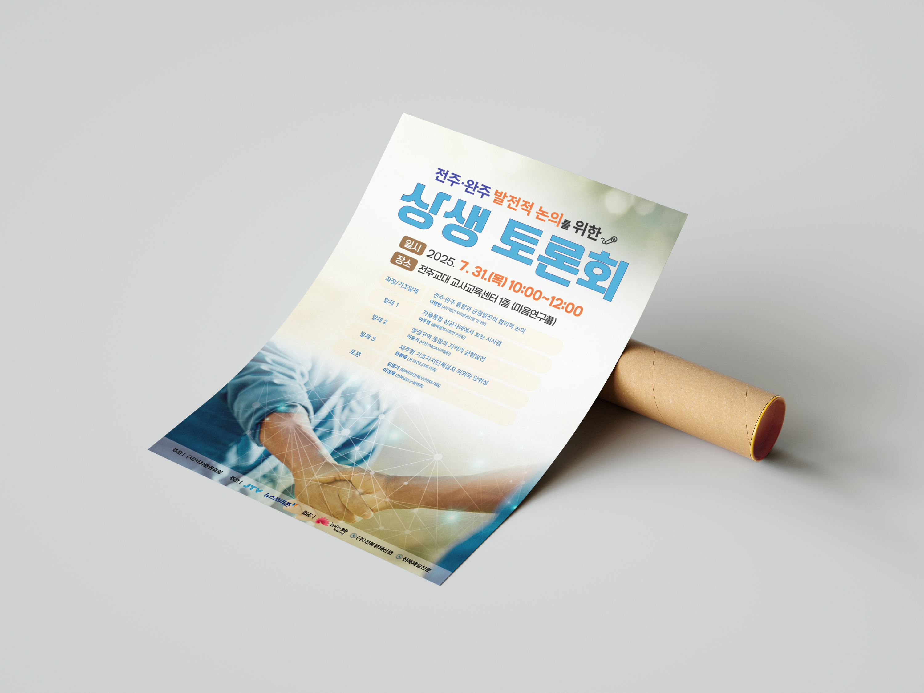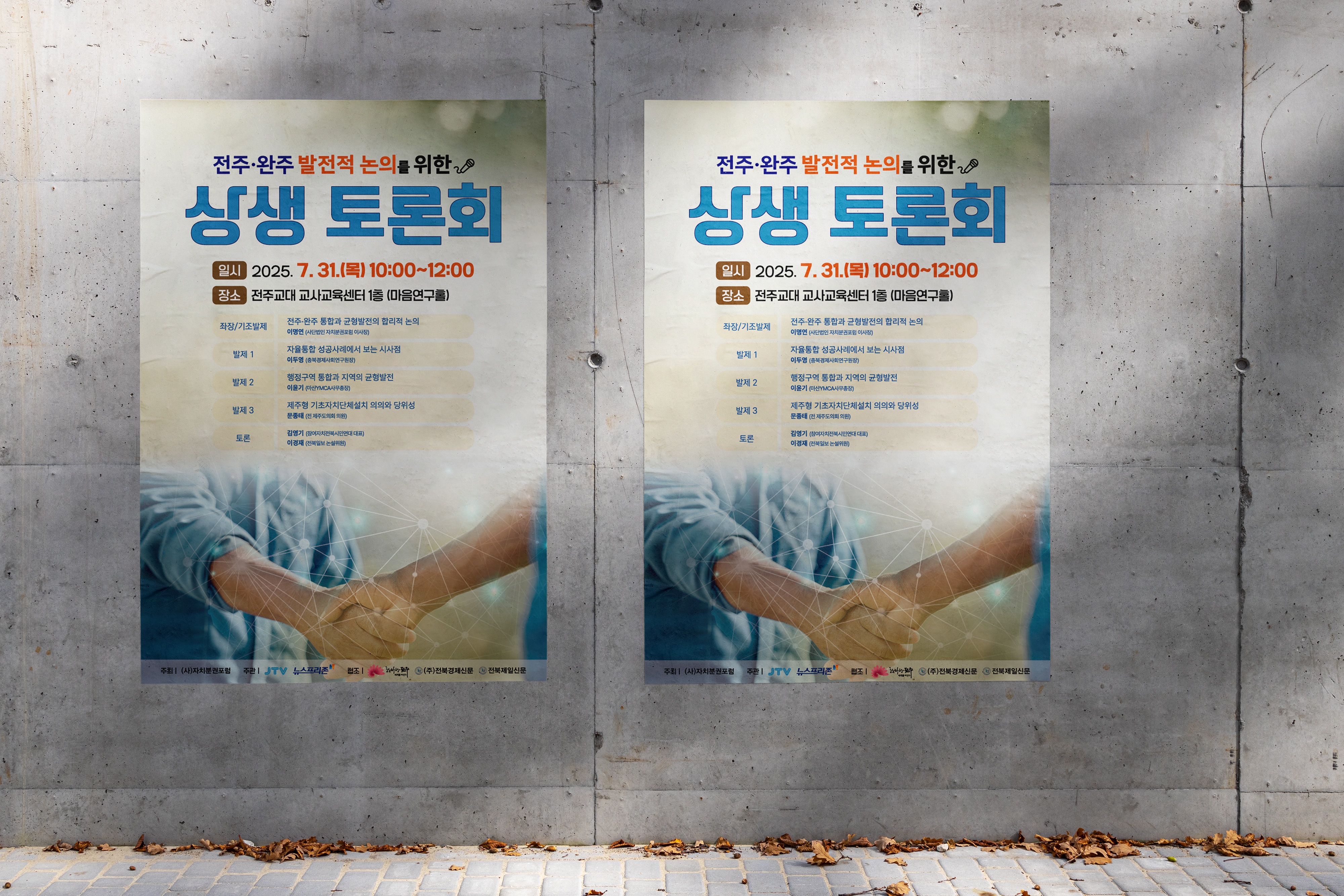 전주·완주 상생 토론회 포스터 전주·완주 상생 토론회 포스터 CLIENT (사)자치분권포럼 PERIOD 2025-07-23~2025-07-30 TYPE 포스터 전주·완주 상생토론회 포스터는 협력과 연결의 의미를 시각적으로 전달하는 이미지와 안정적인 정보 배치를 중심으로 제작했습니다.