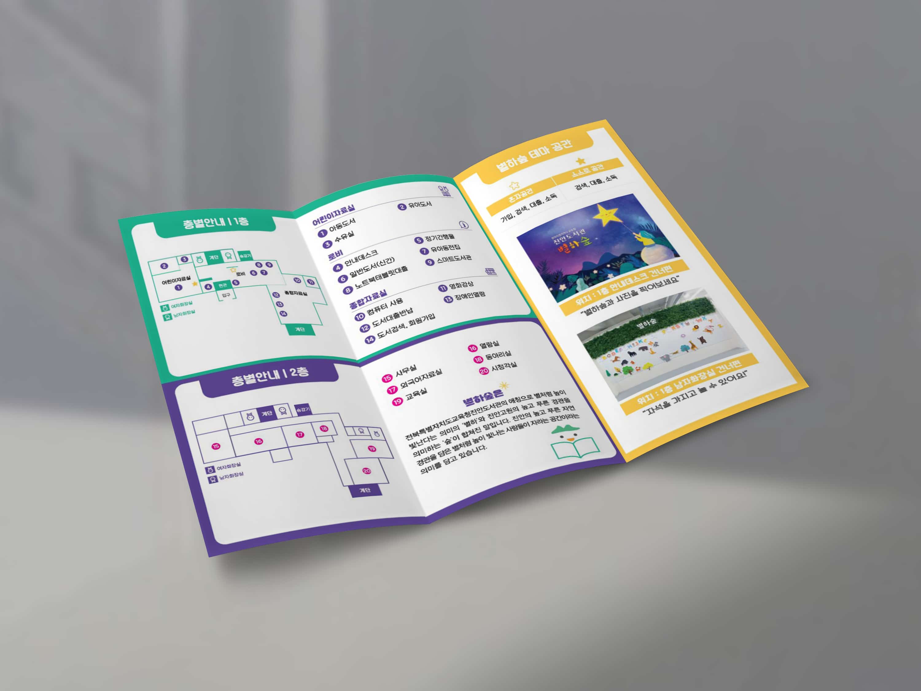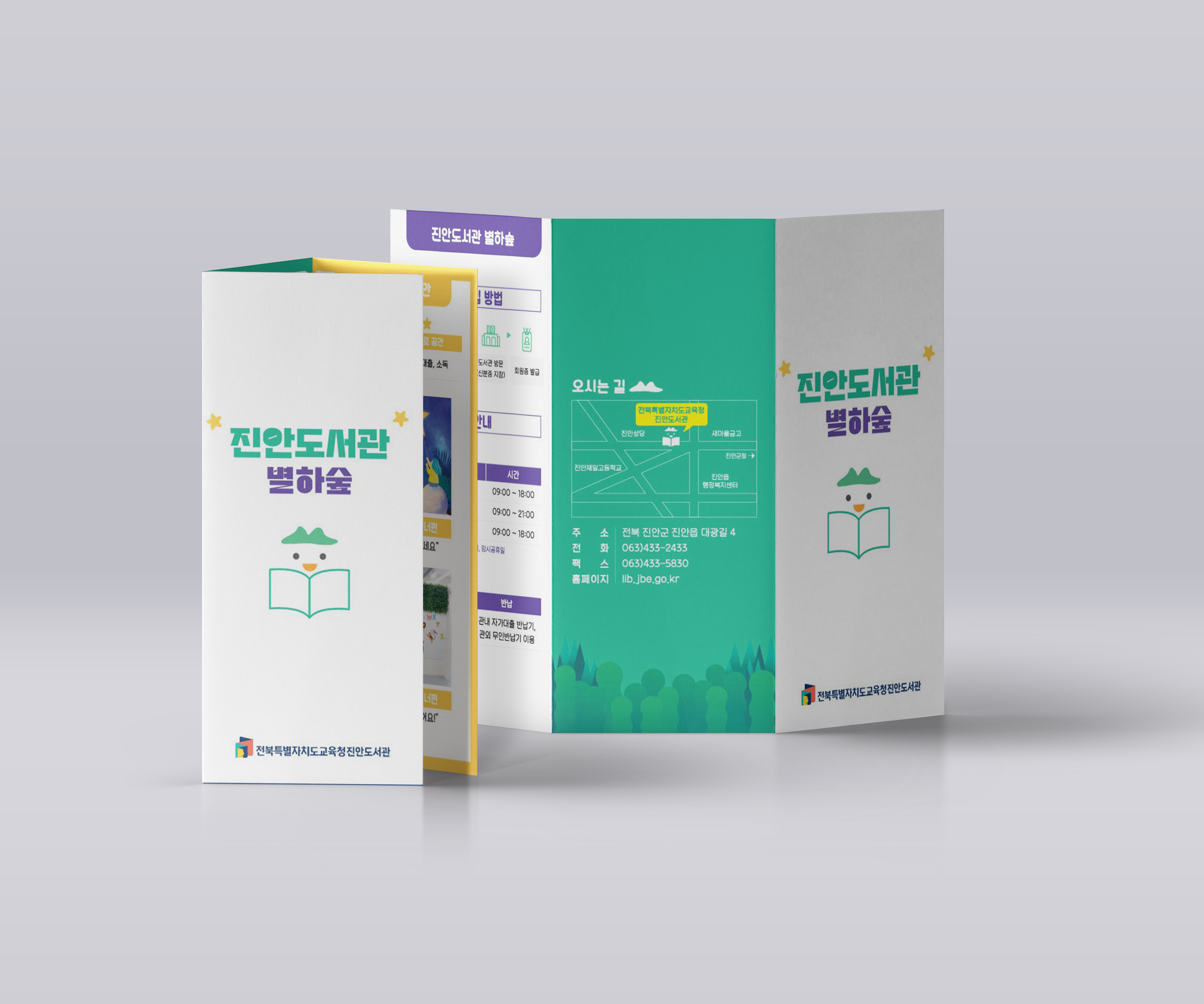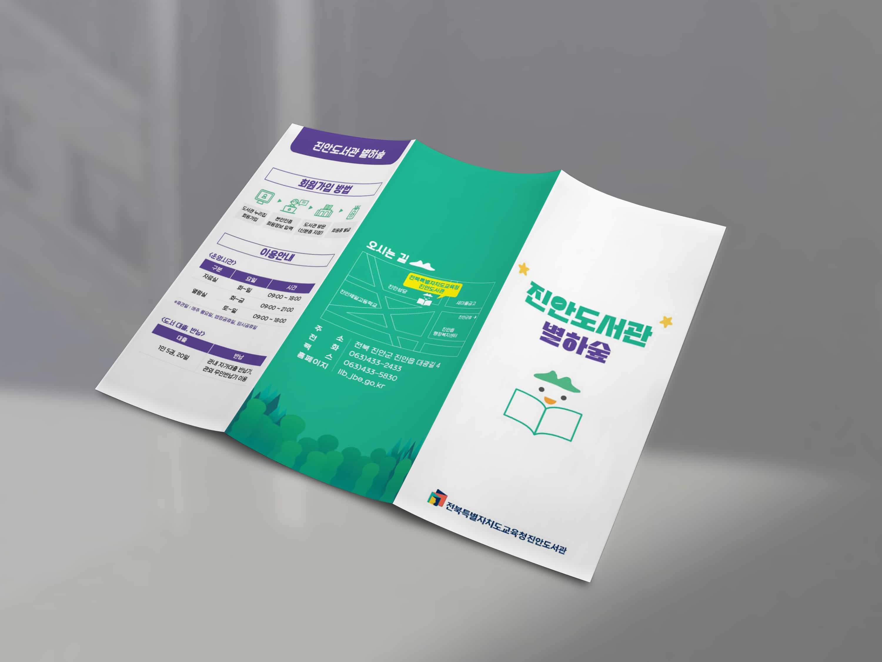 진안도서관 별하숲 3단 리플렛 진안도서관 별하숲 3단 리플렛 CLIENT 진안도서관 PERIOD 2023-12-01~2024-01-19 TYPE 리플렛 진안도서관 별하숲 3단 접지 리플렛은 공간 안내와 이용 정보를 한눈에 파악할 수 있도록 구성한 정보 중심형 디자인입니다.