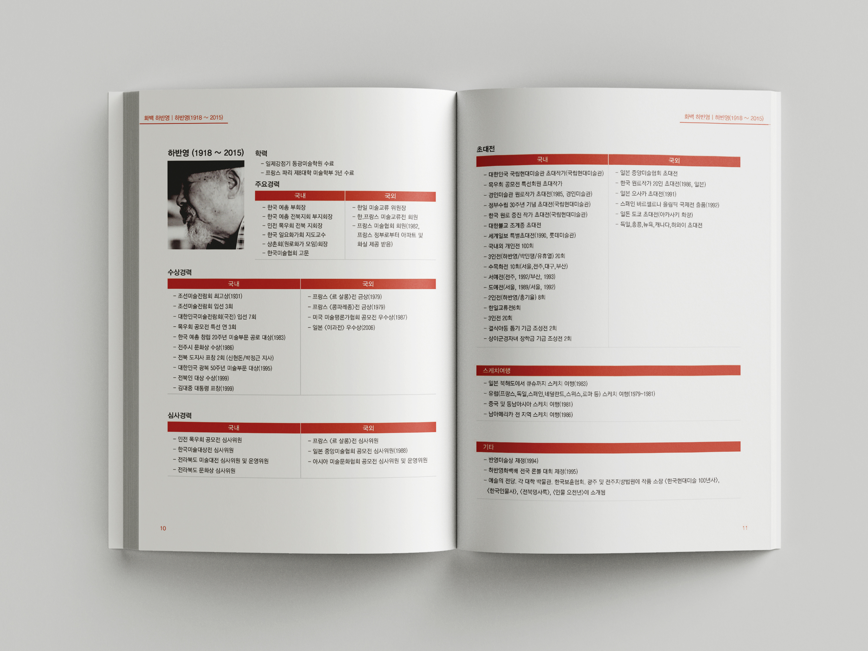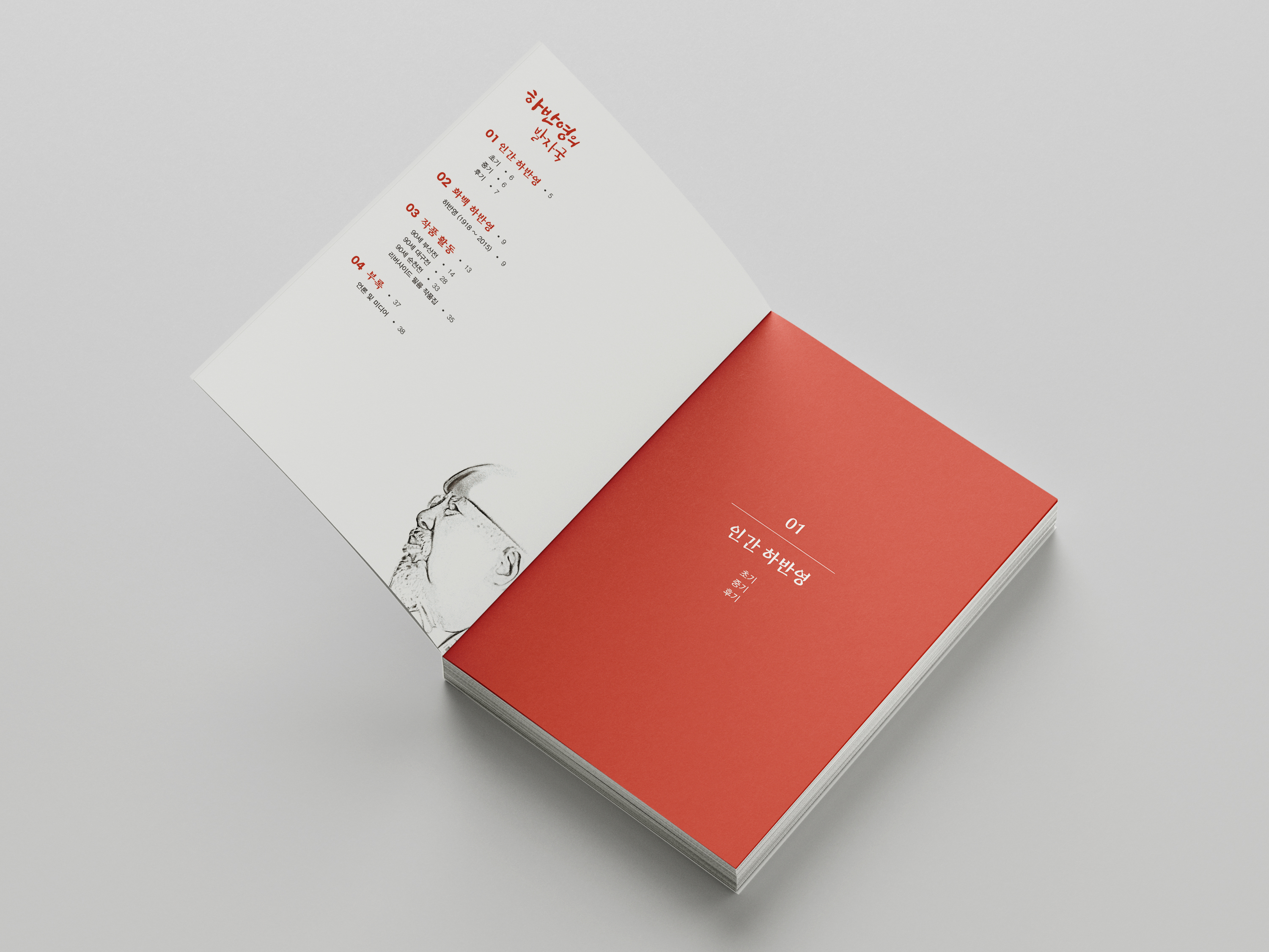 하반영의 발자국 브로슈어 하반영의 발자국 브로슈어 제작 CLIENT 전북대학교 비서실 PERIOD 2024-01-12~2024-01-26 TYPE 브로슈어 작가 하반영의 예술 인생과 작품 세계를 차분하게 기록한 브로슈어입니다. 작품 이미지와 주요 이력을 중심으로 구성해 흐름 있게 읽히도록 설계하고, 여백과 절제된 색감을 활용해 작가의 사유와 작업의 깊이가 자연스럽게 드러나도록 디자인했습니다.
